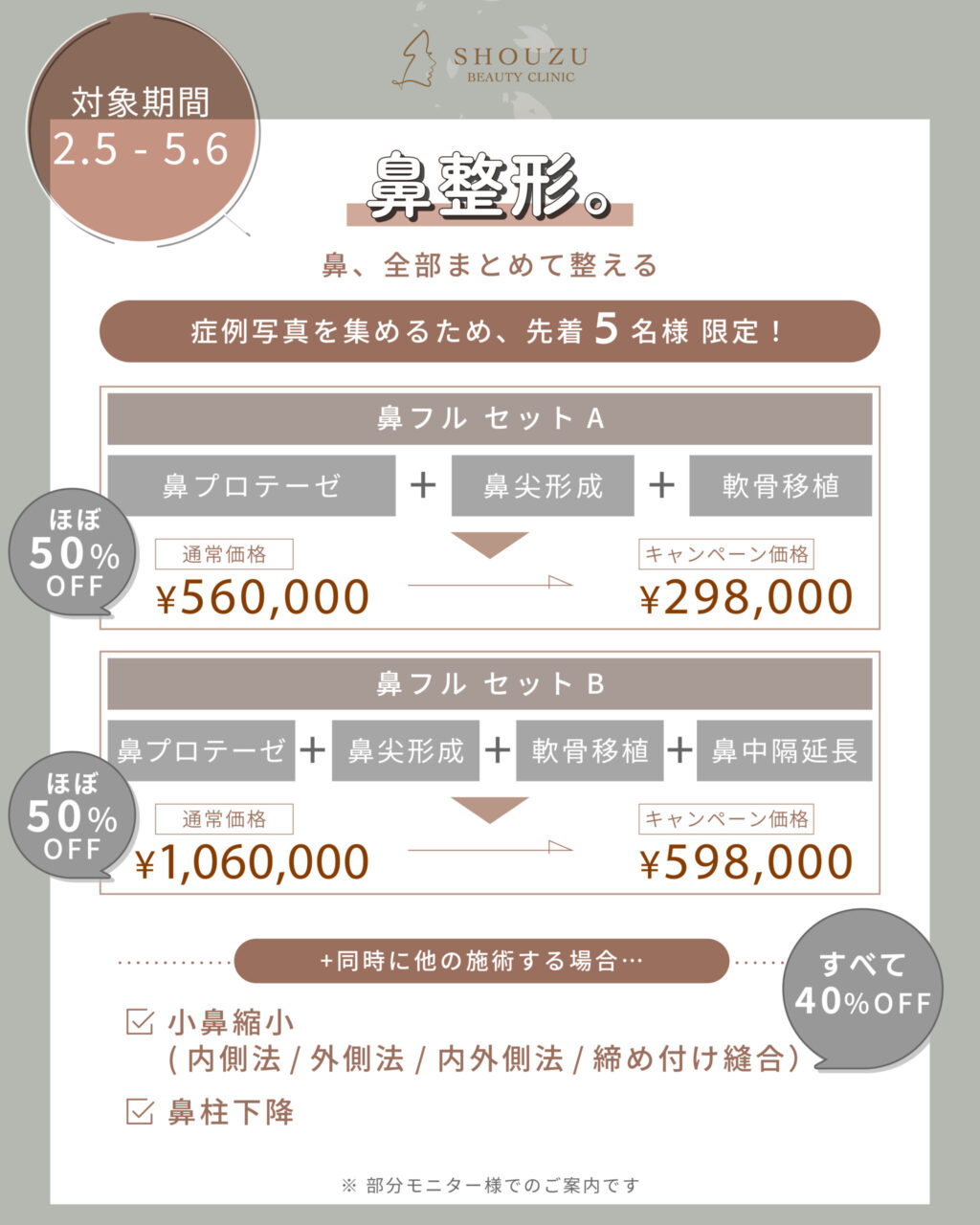 鼻整形が特別価格。鼻フル50% OFF🌸