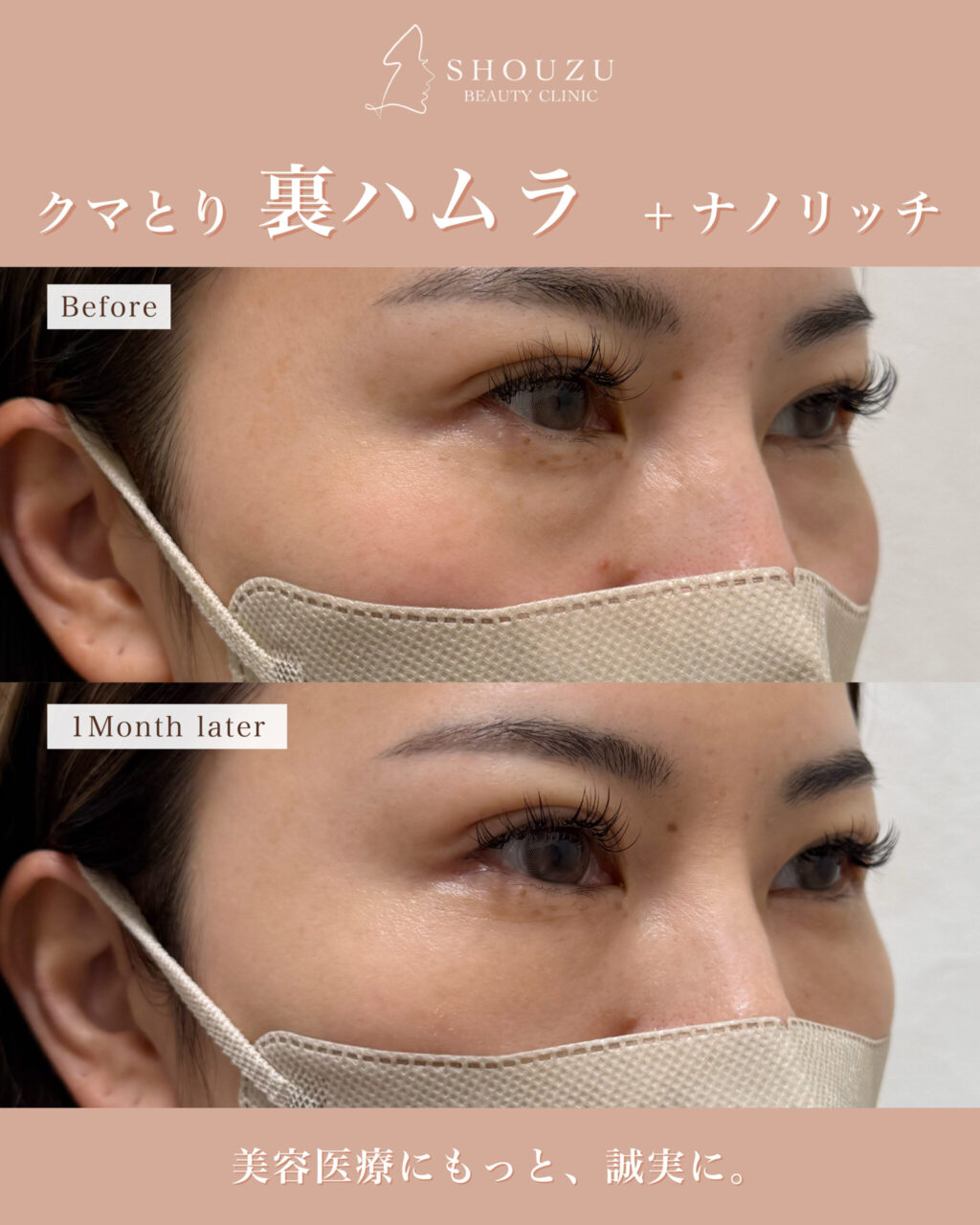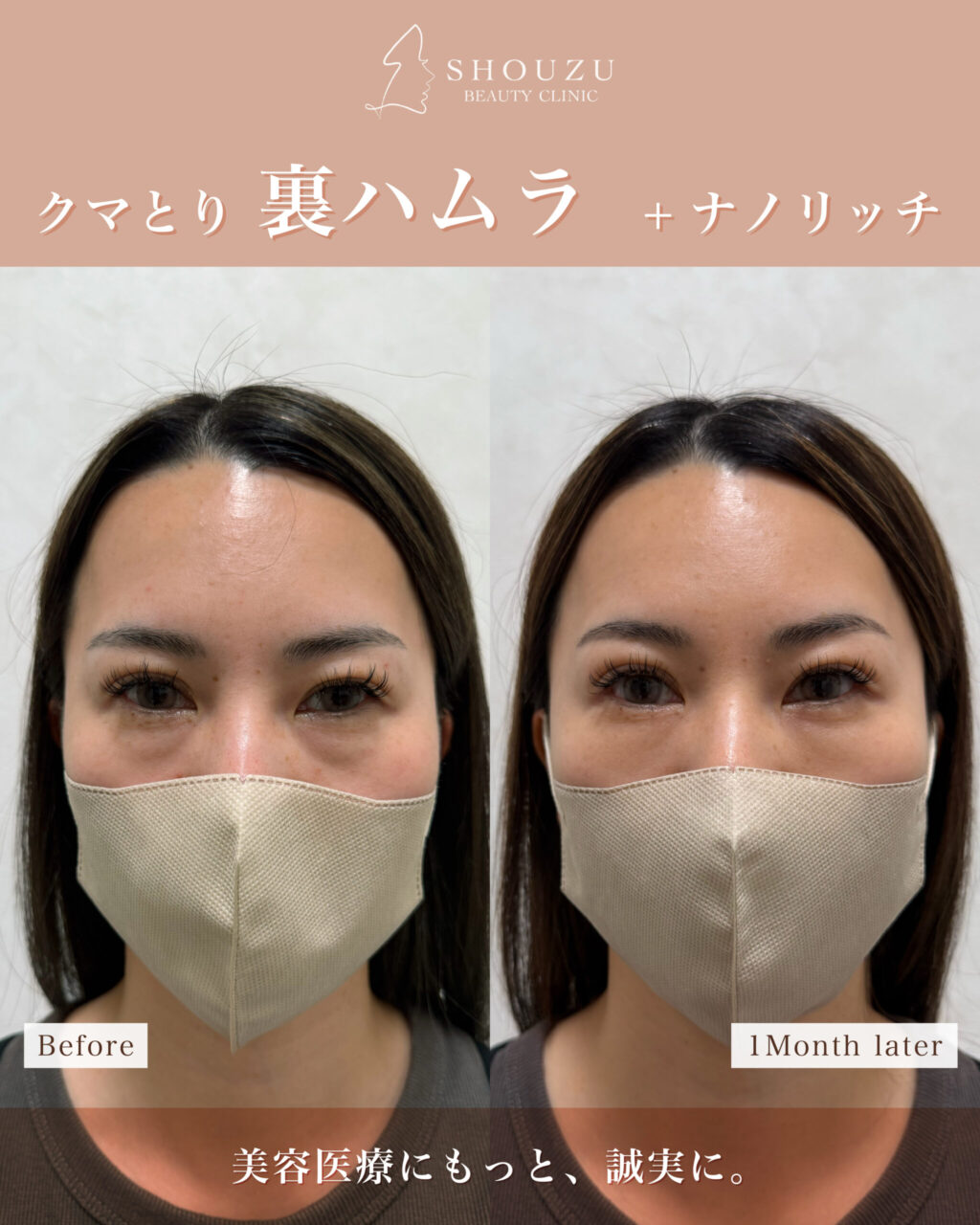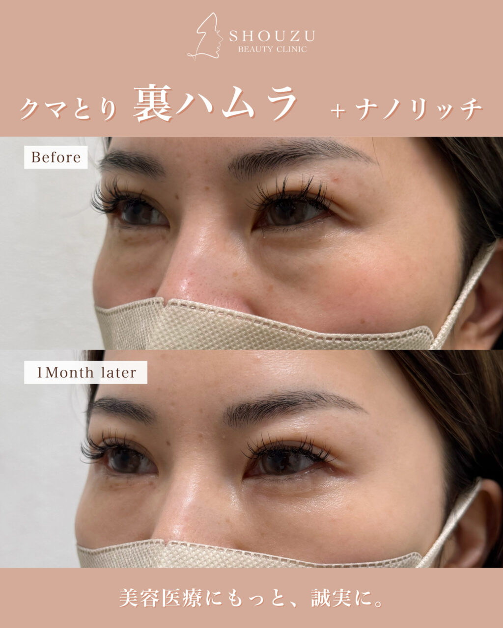 クマ取り 裏ハムラ法 クマ取り 裏ハムラ法+ナノリッチ ⽬元のクマ・たるみ取り 症例⼀覧に戻る 施術情報 クマ取り 裏ハムラ法+ナノリッチ 施術を見る 40代/女性 目の下の脂肪を取るのではなく、膨らんでいるところから窪んでいるところに移動させ、自然に整える若返りの手術です。 さらに濃縮したご自身の脂肪を注入することで肌にハリを持たせ、小ジワを改善する効果があります。 副作⽤・リスクについて だるさ・熱感・頭痛・蕁麻疹・痒み・むくみ・膨らみが残る・まぶたが凹みすぎたと感じる・膨らみや凹み具合など、仕上がりに左右差があると感じる、目がゴロゴロする、小ジワ・シワ・たるみが残るなどを生じることがあります。 料⾦ 通常価格 ¥600,000 モニター価格 ¥520,000 RELATED CASE関連する症例 クマ取り 裏ハムラ法+ナノリッチ+脂肪注入(こめかみ/額) ⽬元のクマ・たるみ取り 脂肪注入 クマ取り 裏ハムラ法 ⽬元のクマ・たるみ取り クマ取り 裏ハムラ法 ⽬元のクマ・たるみ取り クマ取り 裏ハムラ法 ⽬元のクマ・たるみ取り クマ取り 裏ハムラ法 ⽬元のクマ・たるみ取り クマ取り 裏ハムラ法 ⽬元のクマ・たるみ取り