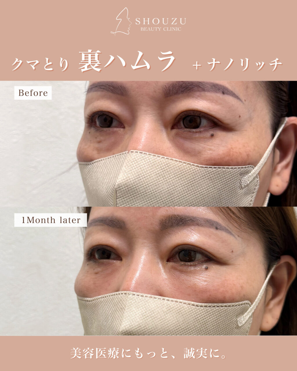 クマ取り 裏ハムラ法 クマ取り 裏ハムラ法 ⽬元のクマ・たるみ取り 症例⼀覧に戻る 施術情報 クマ取り 裏ハムラ法 施術を見る 50代/女性 目の下の脂肪を取るのではなく、膨らんでいるところから窪んでいるところに移動させ、自然な仕上がりで若々しい目元を再現する手術です。 副作⽤・リスクについて だるさ・熱感・頭痛・蕁麻疹・痒み・むくみ・膨らみが残る・まぶたが凹みすぎたと感じる・膨らみや凹み具合など、仕上がりに左右差があると感じる、目がゴロゴロする、小ジワ・シワ・たるみが残るなどを生じることがあります。 料⾦ 通常価格 ¥420,000 モニター価格 ¥370,000 RELATED CASE関連する症例 クマ取り 裏ハムラ法+ナノリッチ+脂肪注入(こめかみ/額) ⽬元のクマ・たるみ取り 脂肪注入 クマ取り 裏ハムラ法 ⽬元のクマ・たるみ取り クマ取り 裏ハムラ法 ⽬元のクマ・たるみ取り クマ取り 裏ハムラ法 ⽬元のクマ・たるみ取り クマ取り 裏ハムラ法+ナノリッチ ⽬元のクマ・たるみ取り クマ取り 裏ハムラ法 ⽬元のクマ・たるみ取り